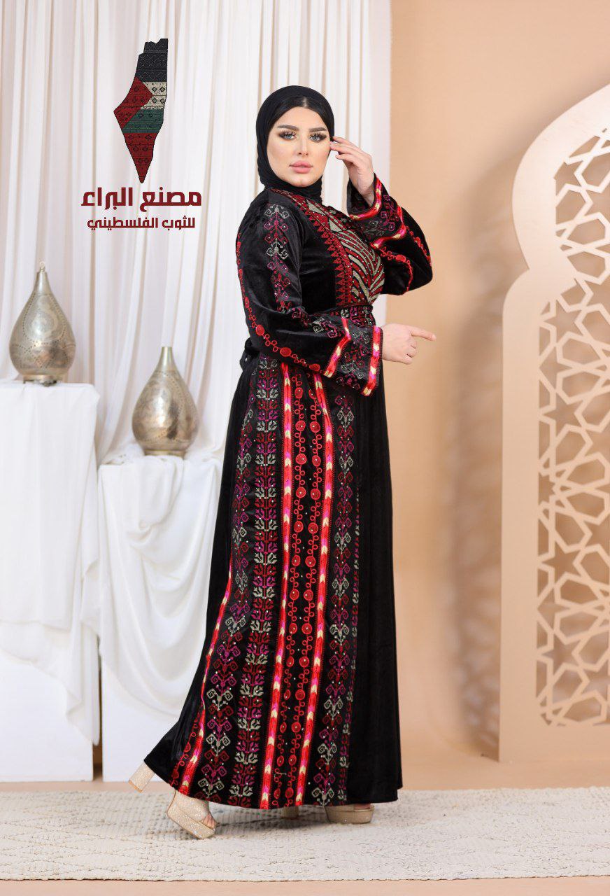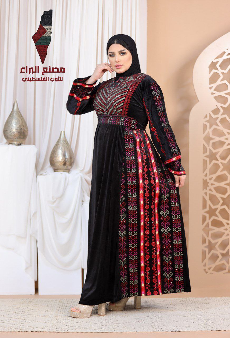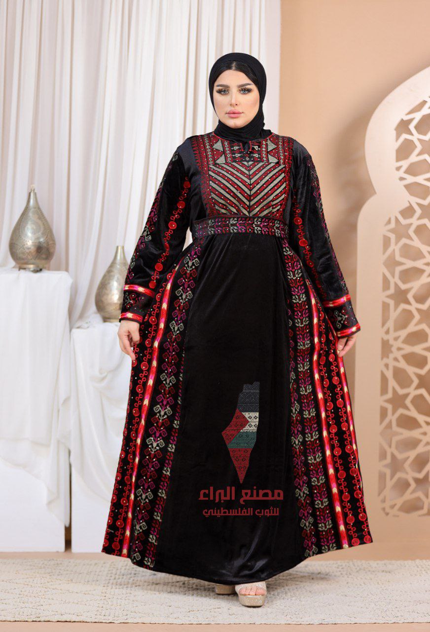 اسم الموديل : ملكي بالمخمل الالماني الخامة : مخمل الماني تطريز : ايتامني فلسطيني المقاسات مقاس 1 مقاس 2